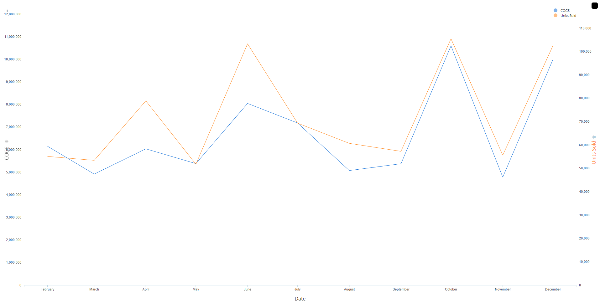 Uses a decorated chart to fill in the 5th grid column with a second y-axis, and render both sets of series with their corresponding scales.