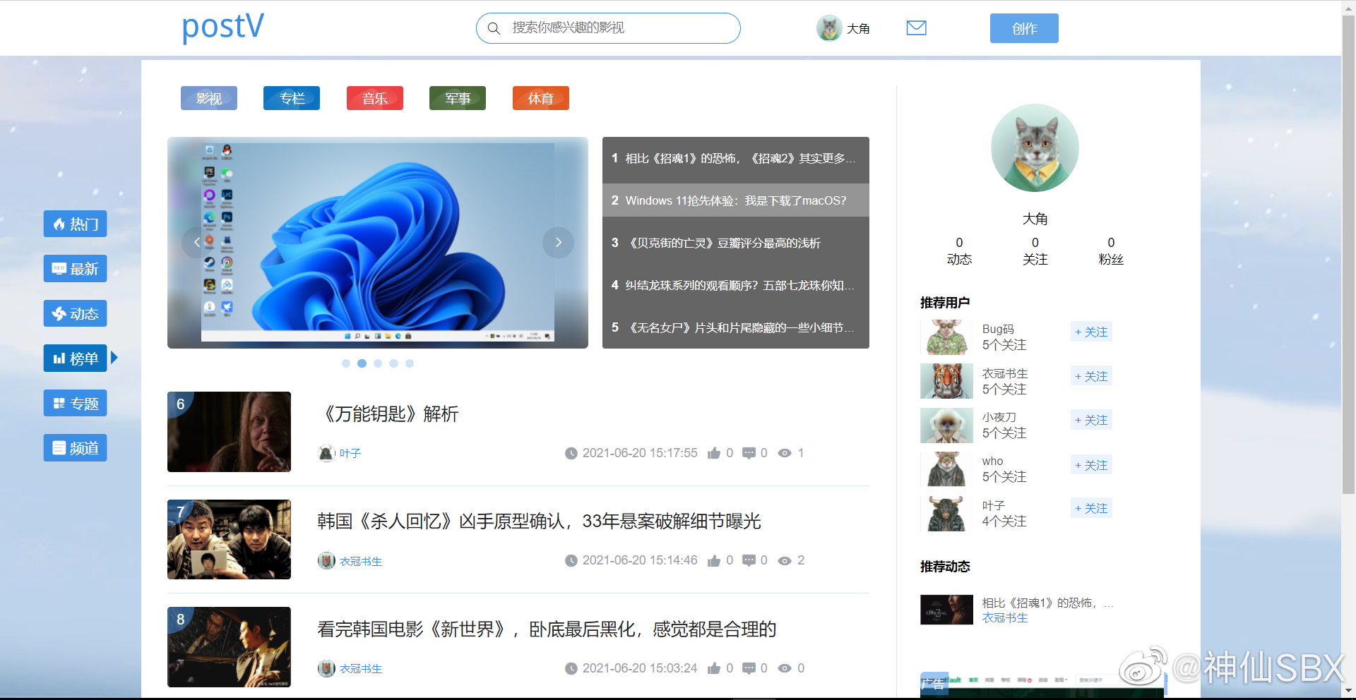 postV postV演示视频 一个基于vue的娱乐型社区,前端页面采用vue 后台管理系统也是采用vue, 后台编码则是koa2+mySQL 首页局部图片 专题 用户可以加入专题小组讨论相关话题 频道 频道这里有各种相关的频道分类视频如足球,篮球,搞笑,音乐等 其它功能还有品论,点赞,私聊等 排行榜 Project setup npm install Compiles and hot-reloads for development npm run serve Compiles and minifies for production npm run build Customize configuration See Configuration Reference.