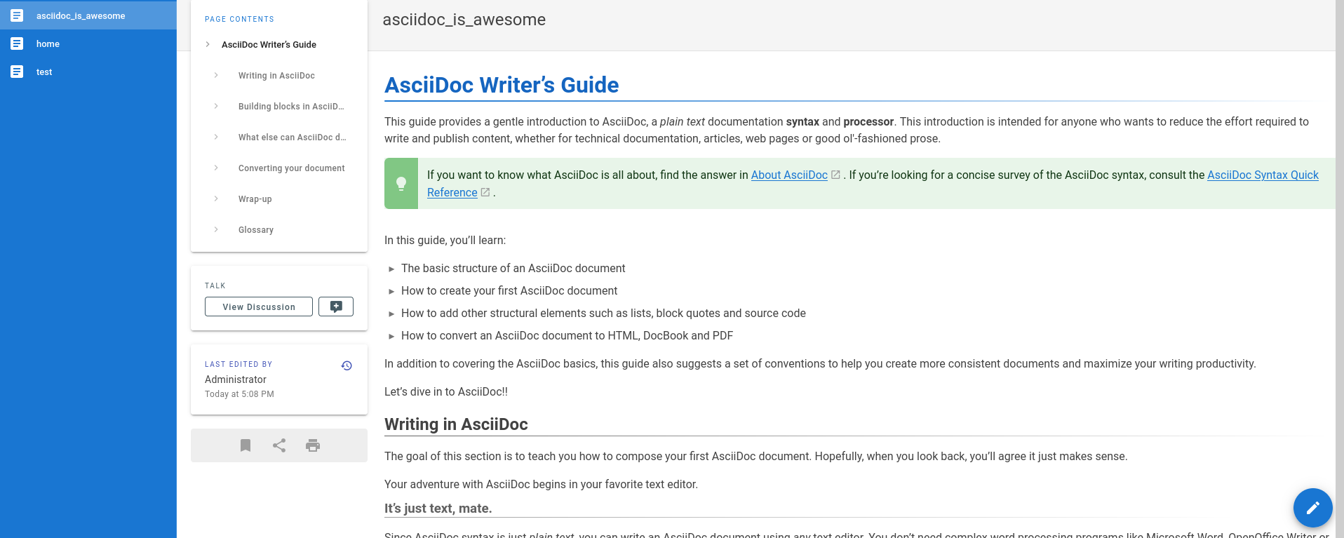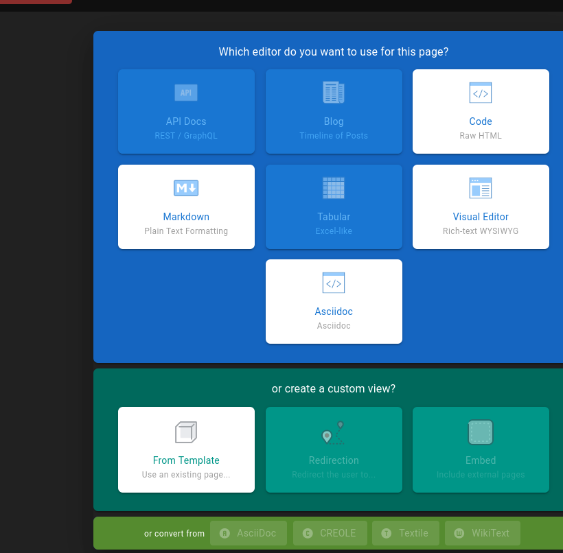 Support for creating and editing pages using asciidoc (according to request https://feedback.js.wiki/wiki/p/support-asciidoc-format).