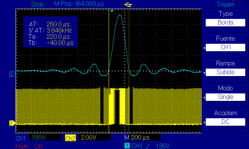 Utilicé dos MCP602 que tienen dos opamps por integrado pero podrian usar un solo MCP604. Todos los componentes de este ejemplo pueden ser conseguidos en México en AG Electronica. Un LM324, que es más facil de conseguir en cualquier tienda de componentes electrónicos, podría funcionar pero no estoy seguro si pueda dar la misma calidad en la señal. Los resultados de la implementación en físico de todo el sistema se muestran en esta captura de pantalla de un osciloscopio: