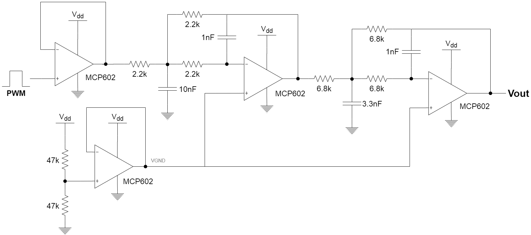 He comentado el código lo mejor que pude haciendo referencias a las páginas de la datasheet del PIC16F15313 dónde se puede consultar detalles adicionales. Es bastante corto y espero será facil de entender si se revisa directamente. Finalmente se construyo un filtro activo pasa-bajas de orden 4 diseñado en la herramienta Filter-Pro de Texas Instruments (la verción actual sólo puede usarse como aplicación web). La frecuencia de corte que elegí es de 12 kHz para tener un buen margen para modificaciones del ancho de banda de la sinc pero una de 6-8 kHz podría funcionar tambien. El circuito es el siguiente: