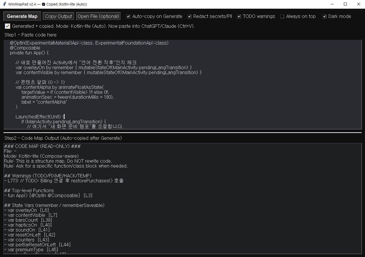 namespace,use,define/const, class hierarchy (extends/implements), method visibility (pub/pro/pri),static/abstract, and return type hints. Global functions are separated from class methods. - Kotlin lite mode (Compose-aware) — imports, declarations, fun signatures + Compose patterns: