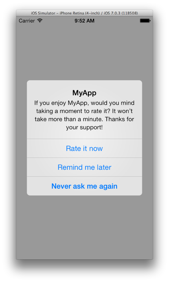 - If the user chooses "Rate now" or "Never ask me again" alert won't be shown again.