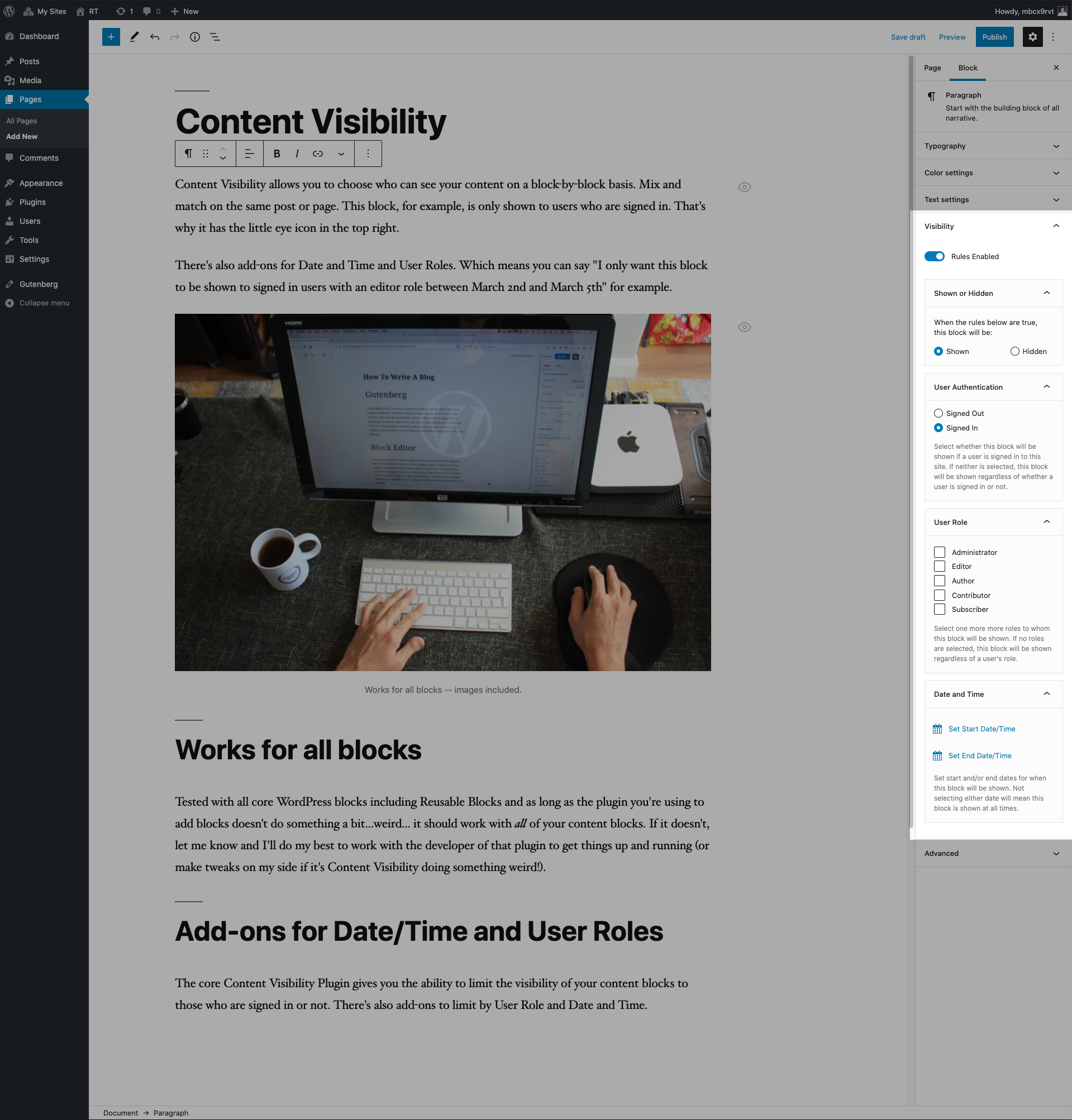 Every individual block on all posts and pages on your site can have their own controls. Mix and match the visibility of blocks on a single page. Need some blocks to show to everyone and a few to only be available to your site's subscribers? No problem. Only want a message to appear on Christmas Day? You got it. Only want those who are signed in to your site to see certain pieces of content? Easy peasy.