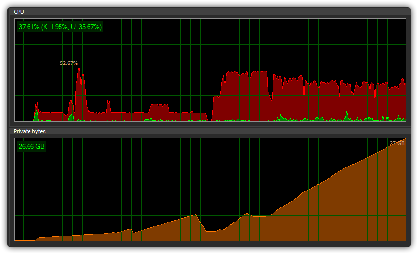 I haven't figured out what exactly is causing it to start consuming all the RAM, but I can reproduce it consistently on my project. (apologies for not having a minimal reproduction example).