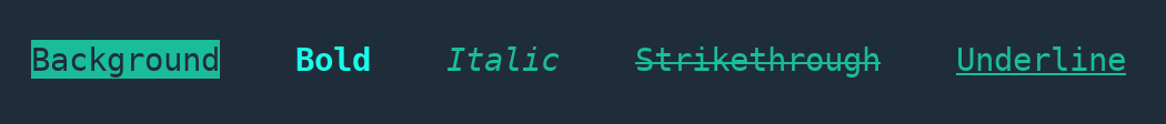 blue, lightblue, purple, light purple, orange, yellowbold, bg, under, strike, italicinfo, que, run, bad, goodNote: Windows versions below windows 10 do not support ANSI escape sequences so the colors will not be printed in command prompt.