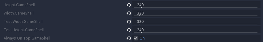 Project Settings > Display > Window: set the window width and height to 320x240. This is the GameShell screen resolution. Also set the always on top option.