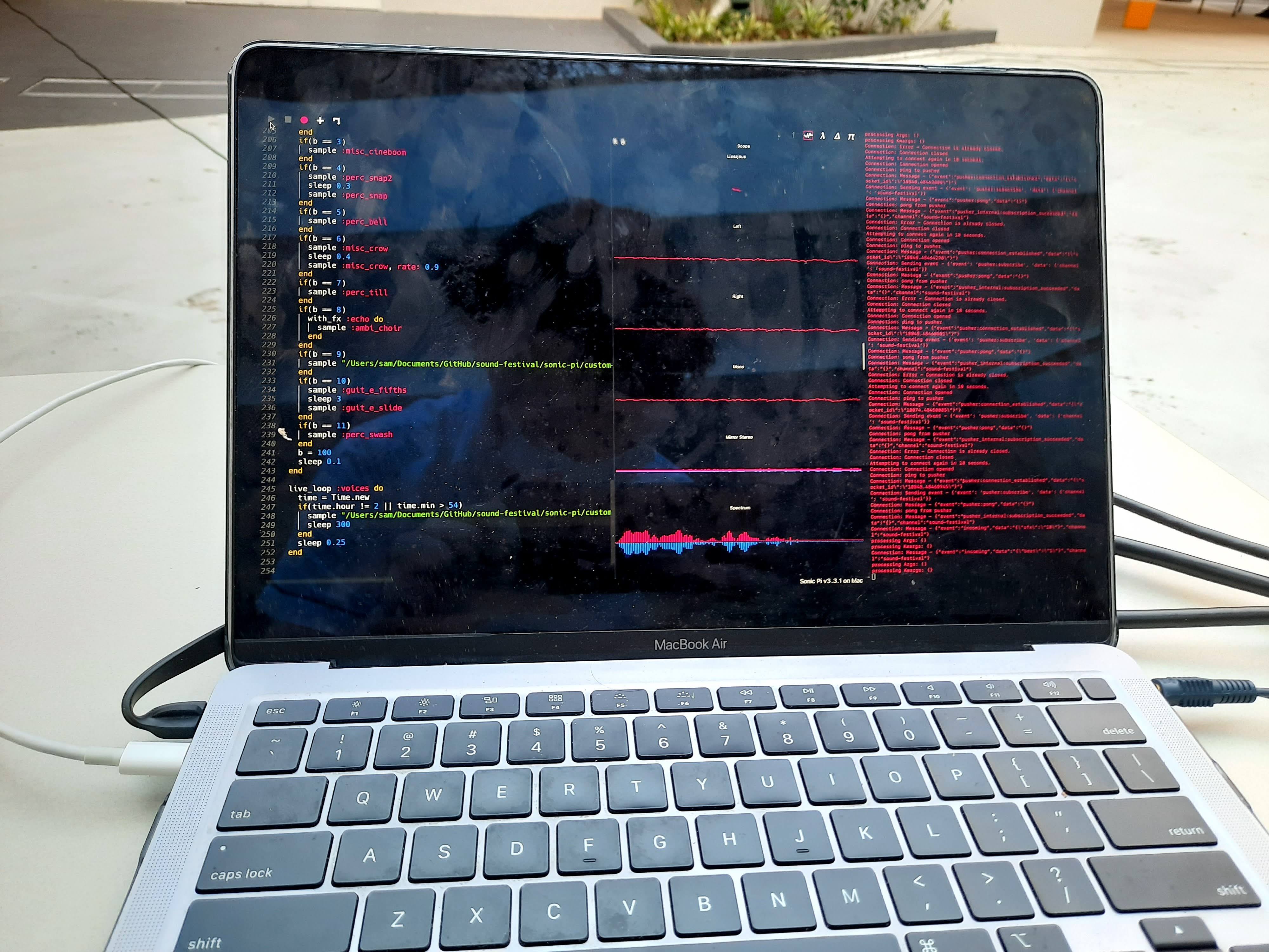 The decorated control boards | The Sonic Pi program running | Students, young and old, enjoying the music |