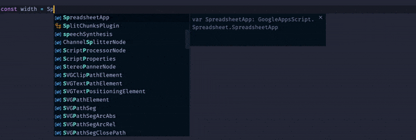 This project includes support for autocompletion and complete type definitions for all Google Apps Script methods.