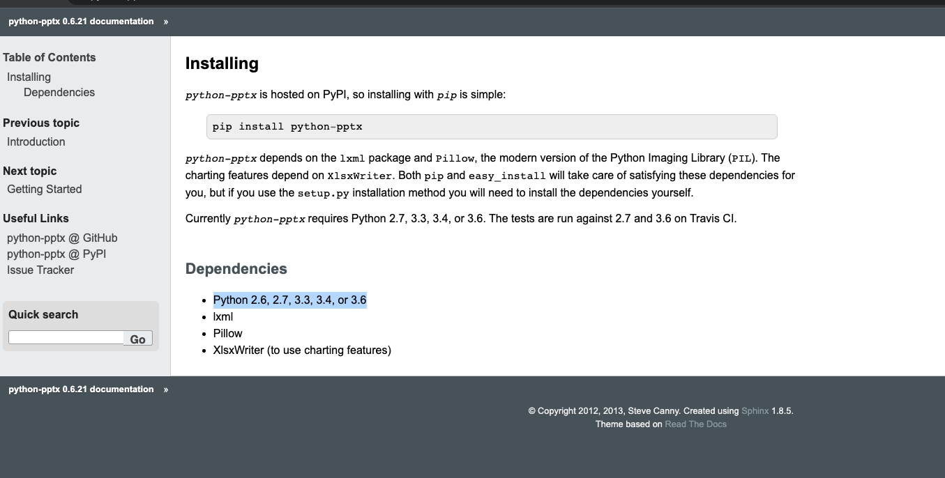 Under the "dependencies" section of the documentation, it is listed that there is a dependency on Python 2.6, 2.7, 3.3, 3.4, or 3.6, and that "The tests are run against 2.7 and 3.6 on Travis CI.":