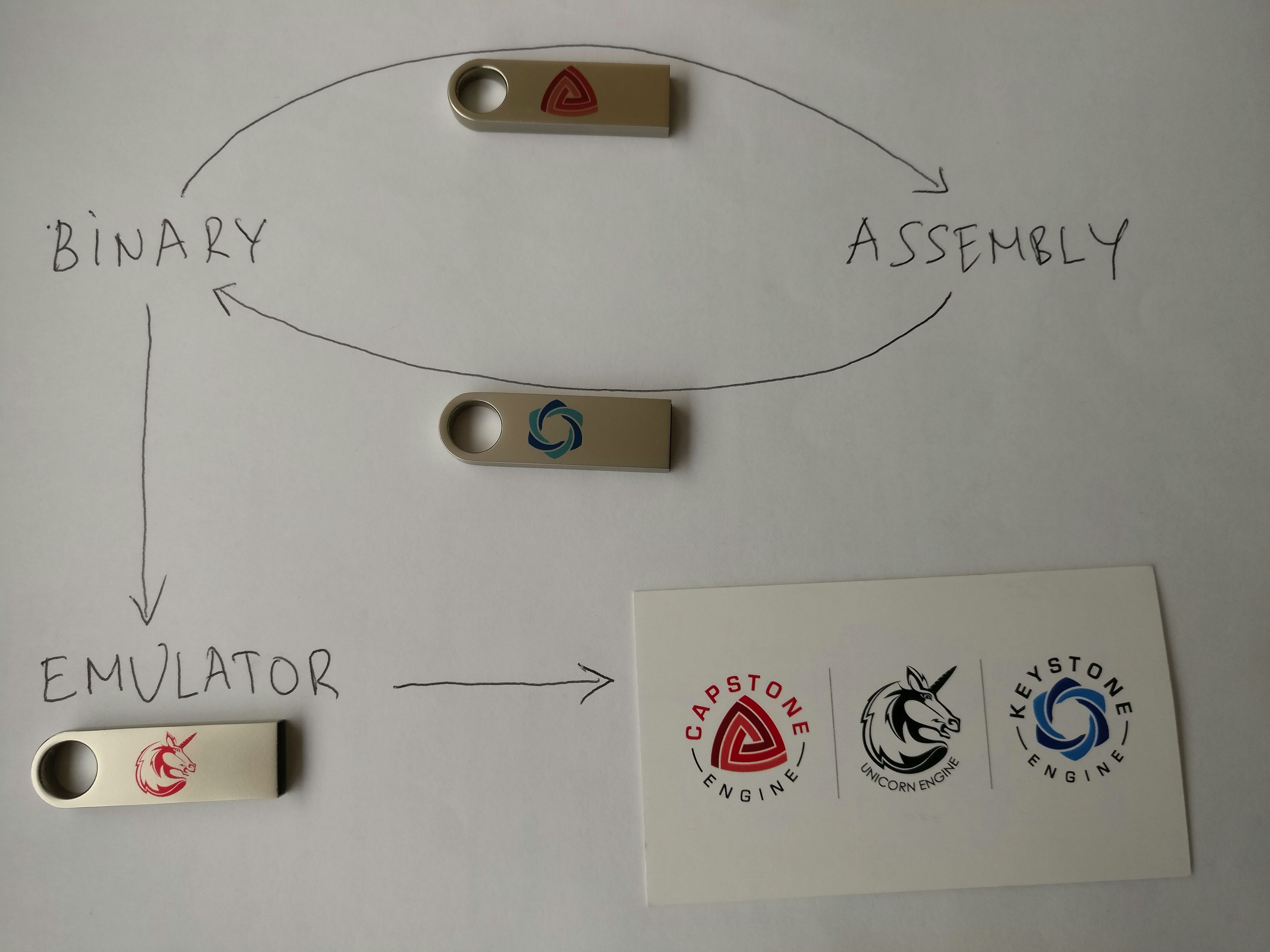 We will bring to Blackhat some swags (like stickers, Tshirts) of the Reverse Engineering Trilogy Capstone/Unicorn/Keystone. See me after our talk if you want them :-)