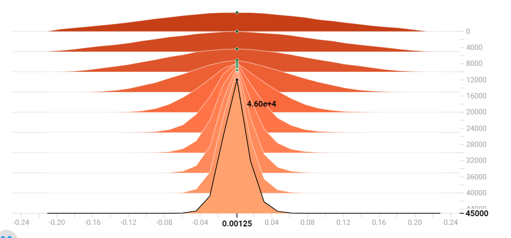 DISTRIBUTIONS 主要用来展示网络中各参数随训练步数的增加的变化情况,可以说是 多分位数折线图 的堆叠。下面我就下面这张图来解释下。