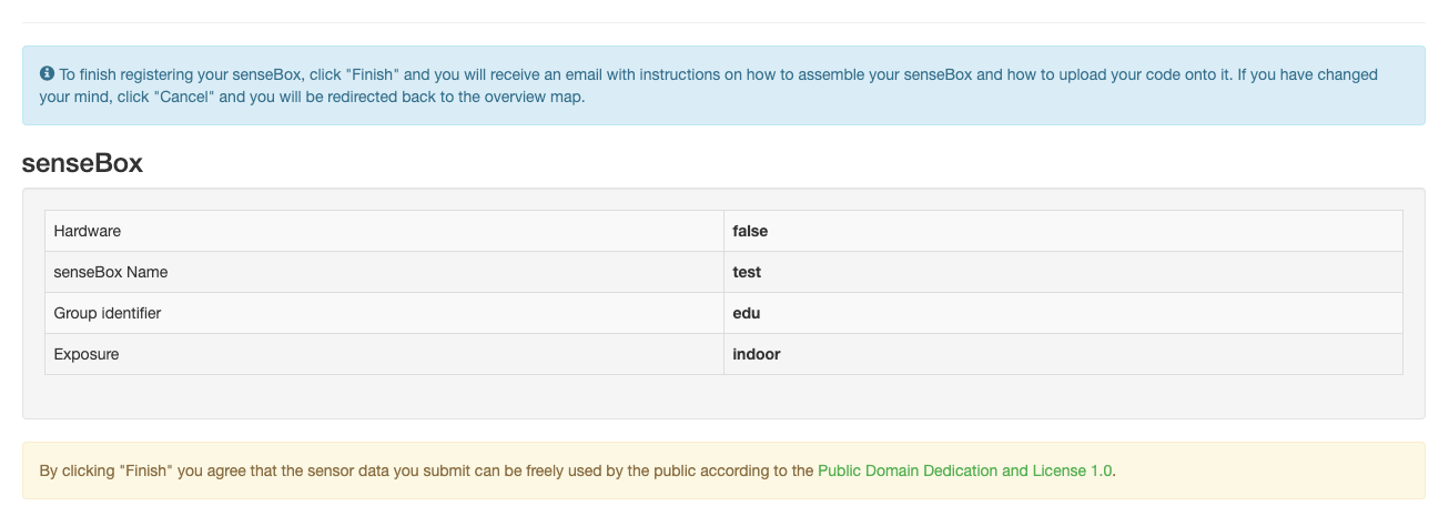 After registering a senseBox:edu (and probably all other devices) with different sensors the user should get a correct overview before clicking on finish. Also the Hardware is always set to false.