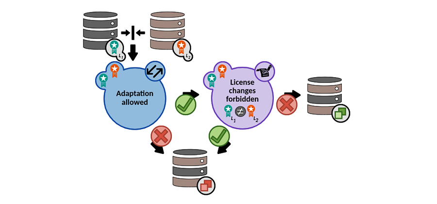 STRep is also capable of assisting users in the assignation of licenses for the new tuned datasets. It includes by default a licenses list and allows the management of all kinds of licenses and their rights. System datasets must be associated with a specific license defined in the platform. Furthermore, as can be easily depicted, the definition of new tuned corpora is limited by the licenses of system datasets combined. Before combining datasets from multiple sources, we should check if licenses of selected datasets guarantee their utilization as sources of the new tuned dataset. As shown in Figure 1a, datasets that do not allow the adaptation should not be combined with other ones. On the other hand, the combination of datasets whose original licenses do not allow their redistribution with other licenses will be only possible when the original licenses of combined datasets are the same.