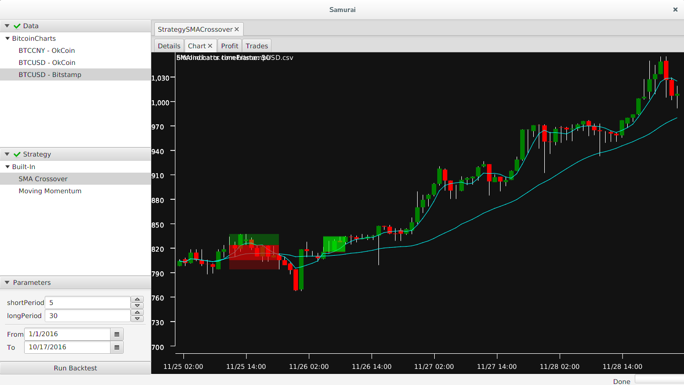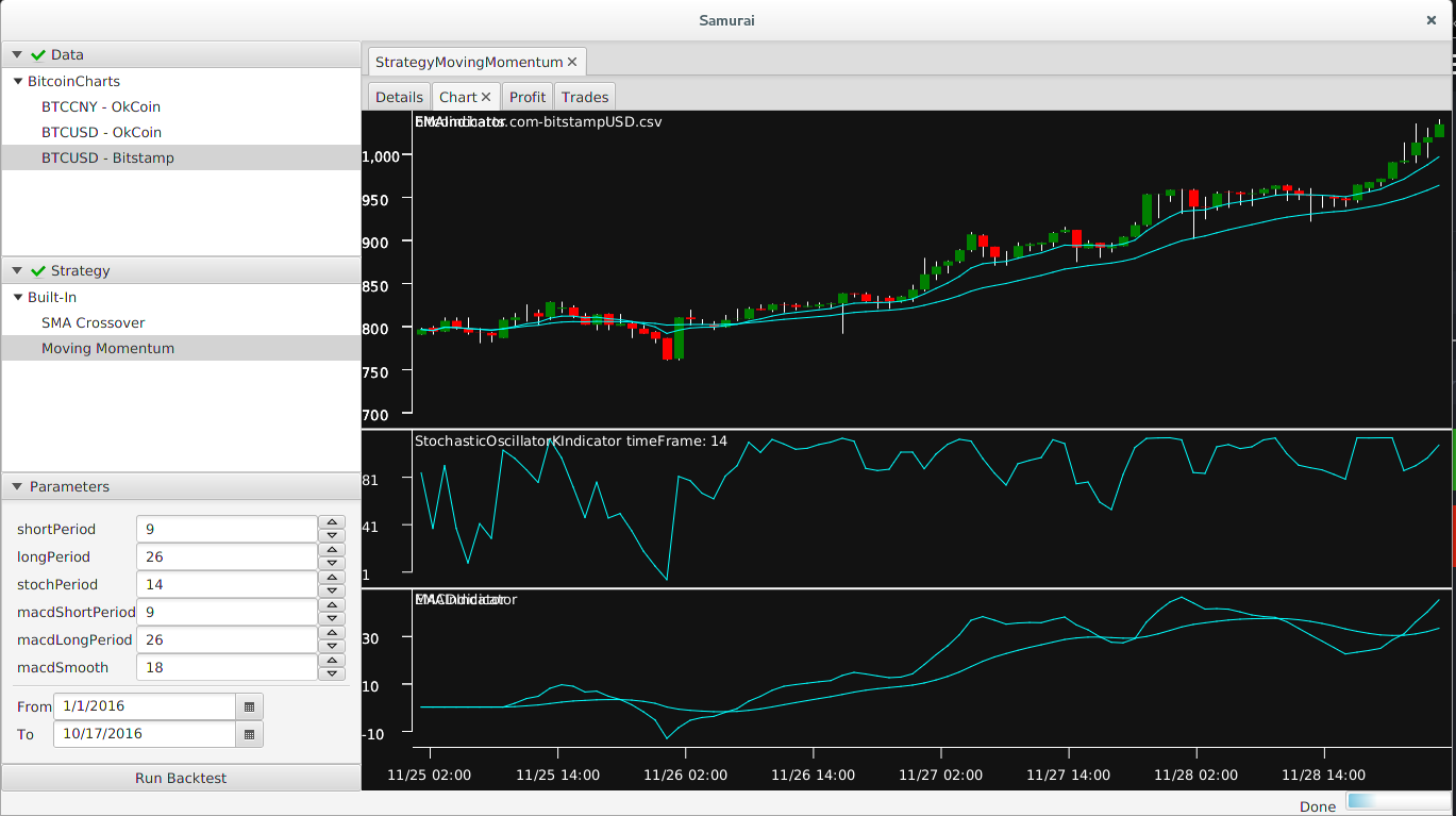 Samurai is a GUI for TA4J. It's supposed to make it easier for you to get insights in how to improve your trading strategy. You will be able to use all the TA4J built-in and custom indicators to create your strategies. When you have written a strategy, you run it over a dataprovider to see how it would have traded. At some point, this will also support automated trading.