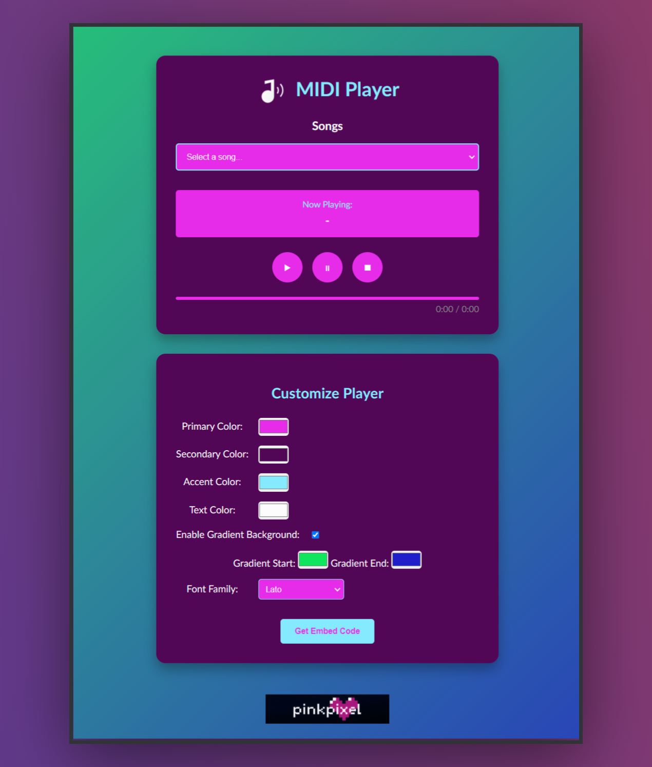 A sophisticated web-based MIDI player implementation featuring a modern, customizable interface and robust playback capabilities. This player offers an intuitive user experience while providing extensive customization options for seamless integration into any web project.