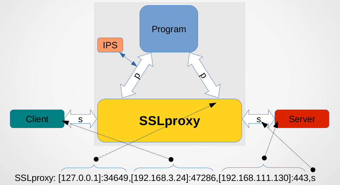 - The first IP:port pair is a dynamically assigned address that SSLproxy expects the program send the packets back to it.