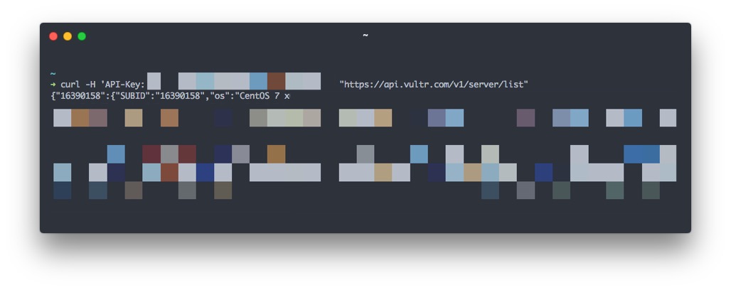 curl -H 'API-Key: YOUR_OWN_API_KEY' "https://api.vultr.com/v1/server/list"同样也要将上面命令中的 API-Key 后面换成你自己的 API_Key,得到返回数据的每个级别就是服务器唯一识别码,即 Server SUBID.