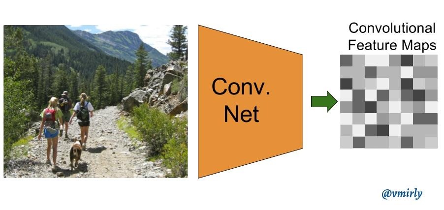 - In the first step, the input image goes through a convolution network which will output a set of convlutional feature maps on the last convolutional layer: