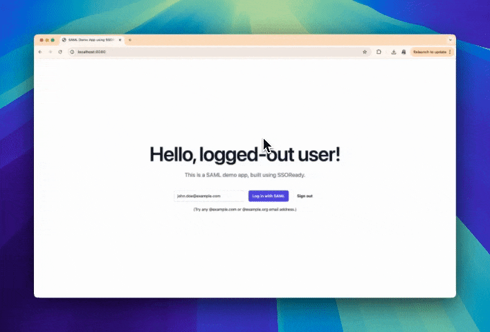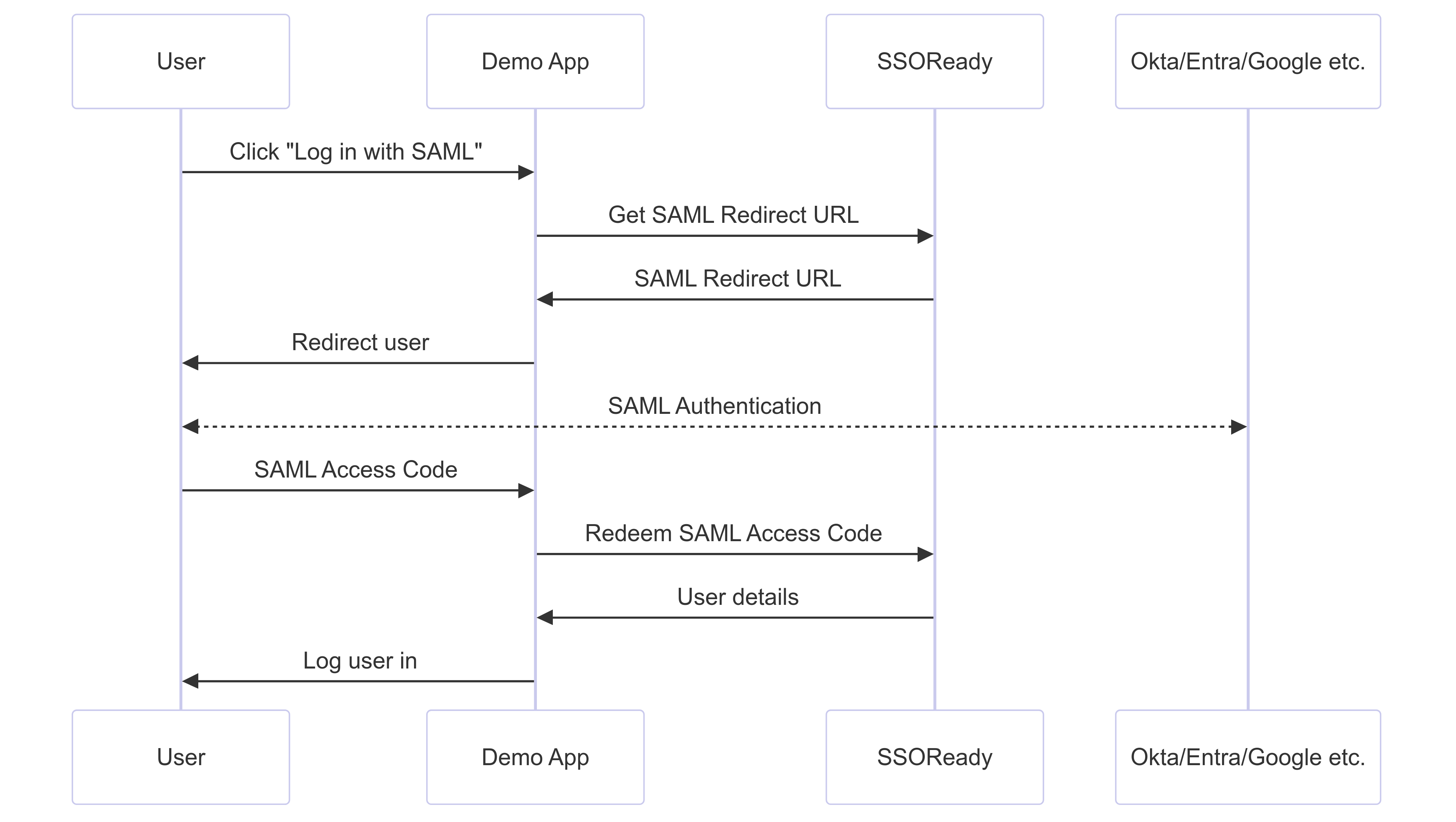 This demo app gives you a crash-course demo of how to implement SAML end-to-end. If you want to see how this all fits together in greater detail, with every step described in greater detail, check out the SAML quickstart or the rest of the SSOReady docs.