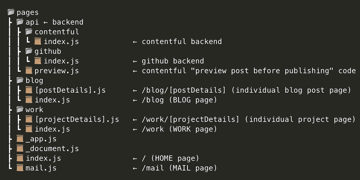 The folder structure in which I organized everything is fairly straight forward. In order to keep things visually simplified, I'm not going to include the files within each folder, only the folders themselves. If you're not familiar with NextJS's file-based routing via the /pages directory, read this before continuing.