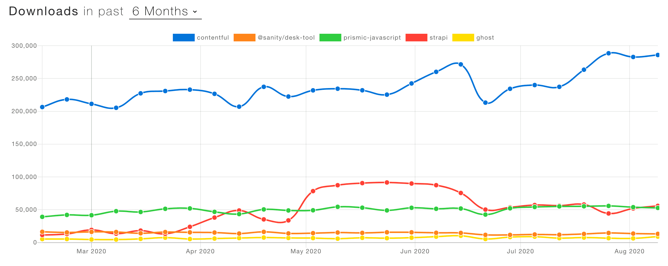 Well, after the first hour of wrapping my head around Contentful, I was pretty content. Honestly, I was just too lazy to spend my day trying to make an educated decision. I headed over to npmtrends.com and compared the CMS's: