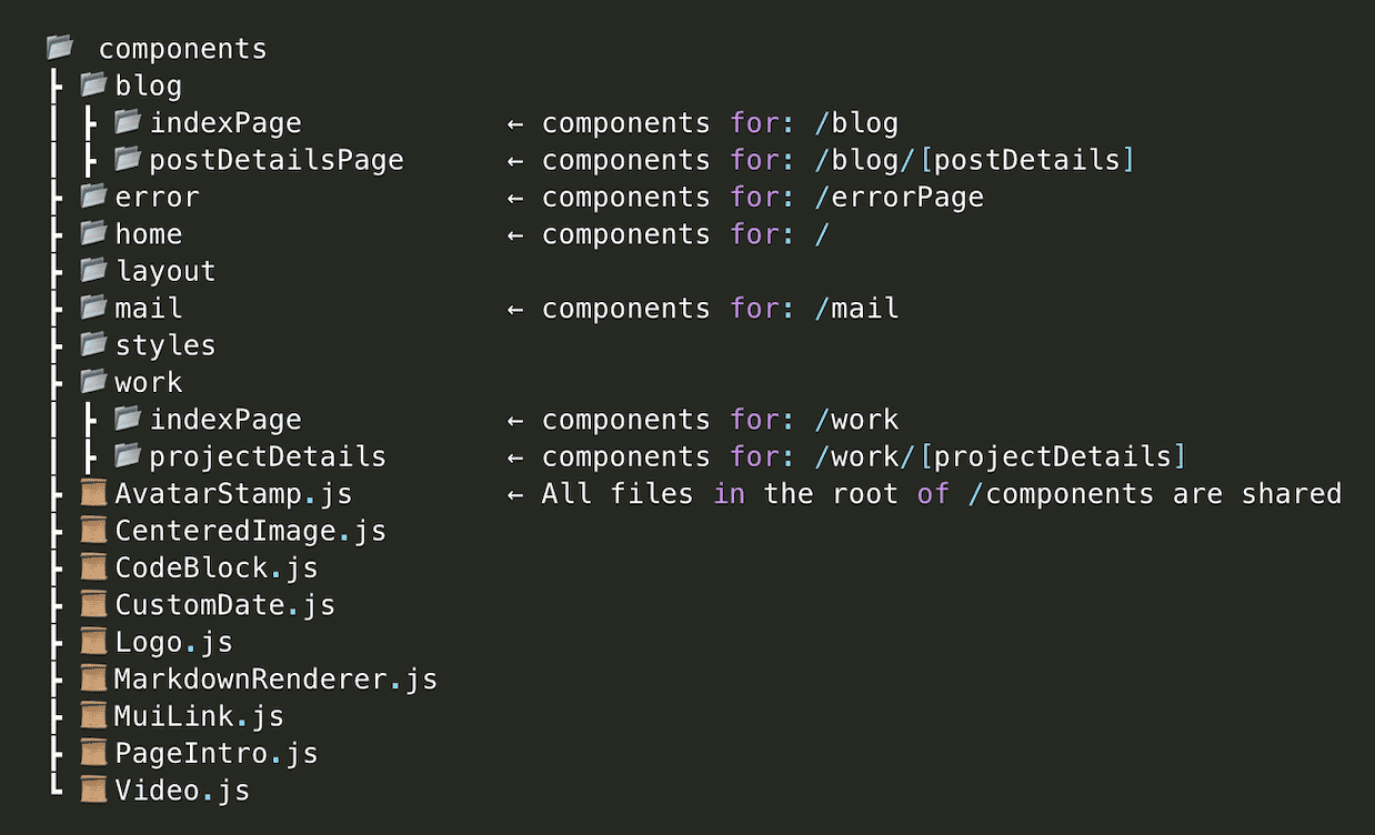 We'll step out of the /pages folder and back into the root of the project. Now, let's checkout what the /components folder looks like. Each folder within the /components folder contains all the components for that specific page. The two exceptions to this would be: