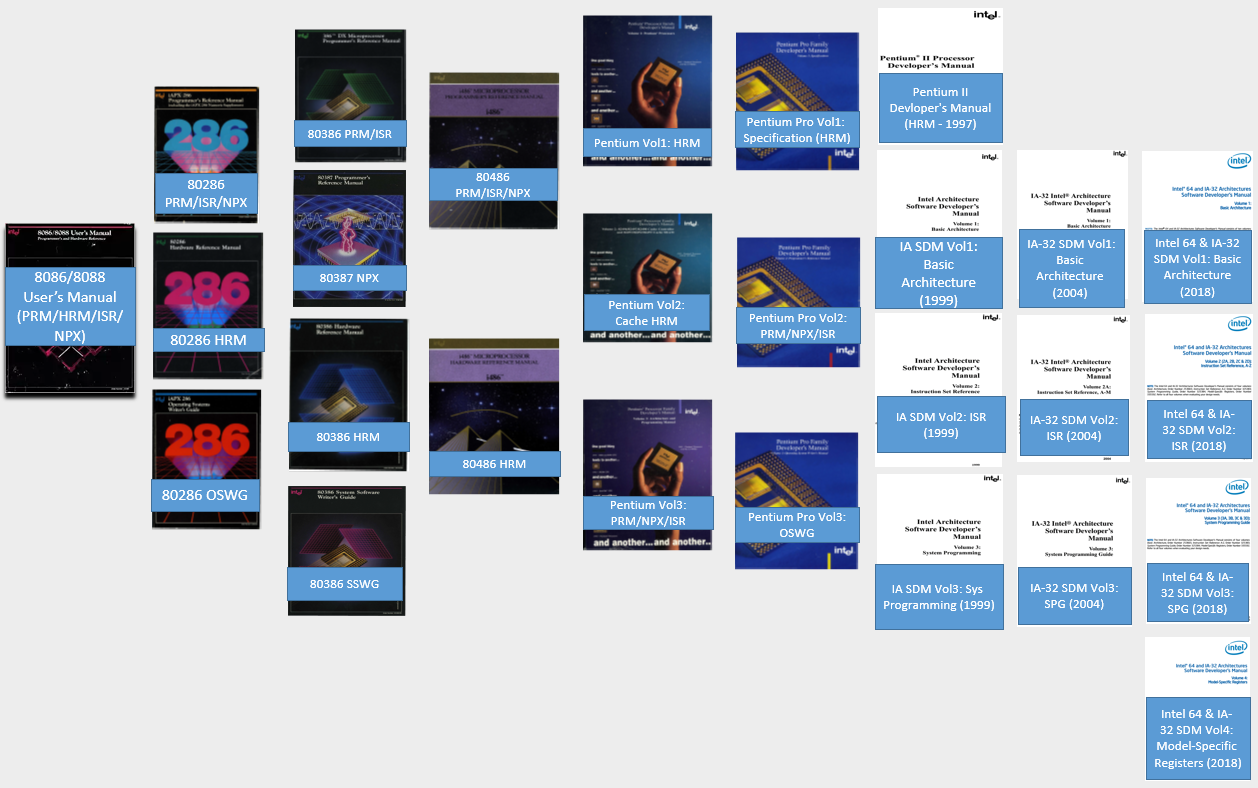 8086, 80286, 80386, 80486, Pentium, Pentium Pro, Pentium II, Pentium III, Pentium 4, Core, Intel Architecture Software Development Manual(SDM), User's Manual.