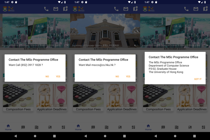 On the top right corner of the app, we set three buttons to provide contact information about the MSc Programme Office. Users can directly give a phone call, send an email or mail to the office if they want to get connect with the programme office.