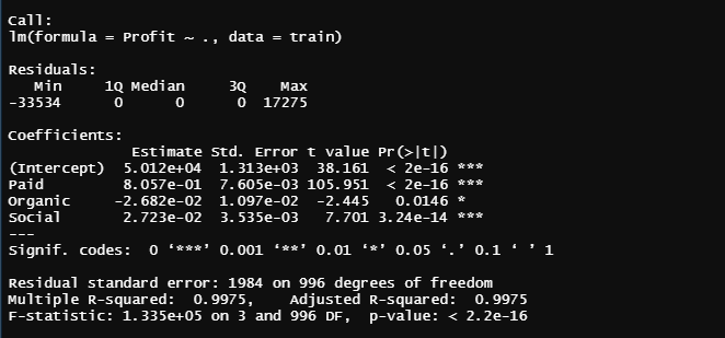 A multiple linear regression problem statement that predicts the profit of a website based on paid traffic, organic traffic and social traffic. The dataset used for this porject "revenue.xlsx" is also present in this repository. Model was built using linear regression and predicted on the test data. The model was validated using root mean square error(RMSE). Model performed really good giving an RMSE value of 7.525523e-11
