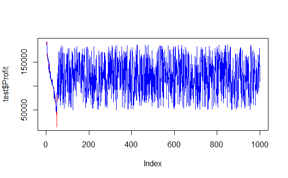 The following figure shows the Predicted vs Actual result on the test data set, where blue represents prediction and red represents actual.