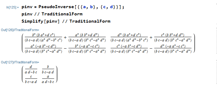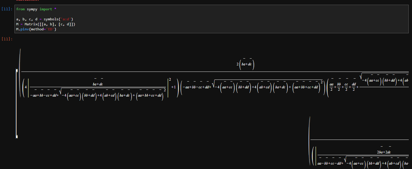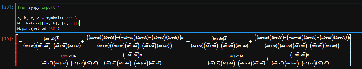 I had similar concerns that random tests may likely fail many times, because complex rationals or square roots can get easily blown up at this state. There should be some things to improve for symbolic diagonalization Using rank decomposition in sympy: Using diagonalization in sympy: And if there exists no method to improve symbolic diagonalization on the earth, I would just believe that diagonalization is not a 'proper' method for symbolic pseudoinverse computation. |