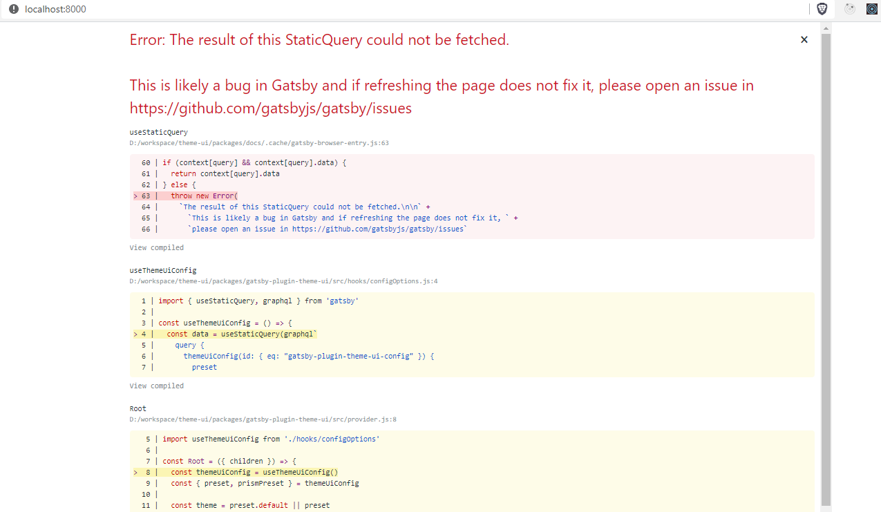 StaticQuery can't be fetched. Page is blank after closing error overlay.