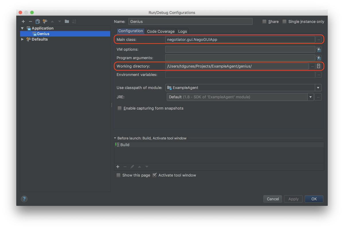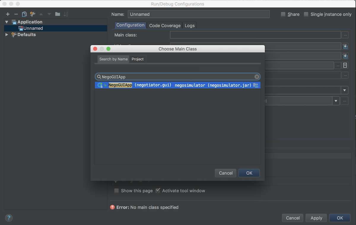 Main classandWorking directoryfields. ForMain class, search forNegoGUIAppand pick main class.