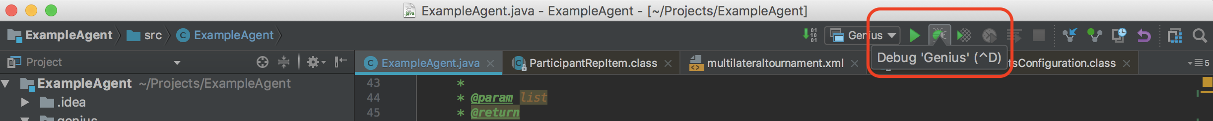- After adding breakpoints (or/and debugging rules), run Genius in debug mode as shown below: