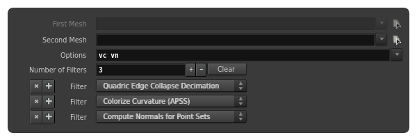Select one or more filters and setup parameters for them. Parameters are similar to MeshLab filter dialogs. If using filters for colorize, compute quality, generate uv, corresponding Options must be present, otherwise MeshLab won't export it. Use the arrow-menu to list all of them. Input geometry can be cached to speedup cooking. Disconnect input and instead select a file.