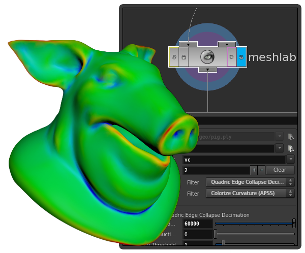 MeshLab filters can be treated as particular SOP nodes doing remeshing, simplification, repairing, colorizing, etc. Since Houdini is a processing application itself, many of the filters are present as actual SOP nodes or can be simulated easy with Houdini instruments. Other filters are unique or doing a better job. MeshLab SOPs can be used in networks as ordinary SOP nodes like PolyReduce, Remesh or Subdivide.