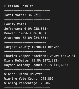 After reviewing the results from the election, one can conclude that using Python to outline and audit election results was a great decision! Running the details of any election through this system would gain the election commission futher needs to focus on other marketing for an eleciton instead of worrying about how the votes will be analyzed. There are a couple different ways in which this script written in Python can be modified to be used for other elections:
