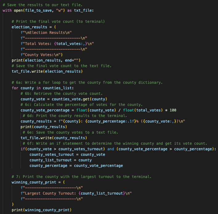 - Add in the "Cty" within the election. This would be beneficial, in case the election commission wanted to pass this script on to a state-wide count.