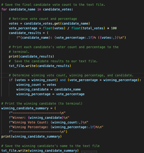Below is the code used to run analysis for Winning Candidate and candidate percentages: