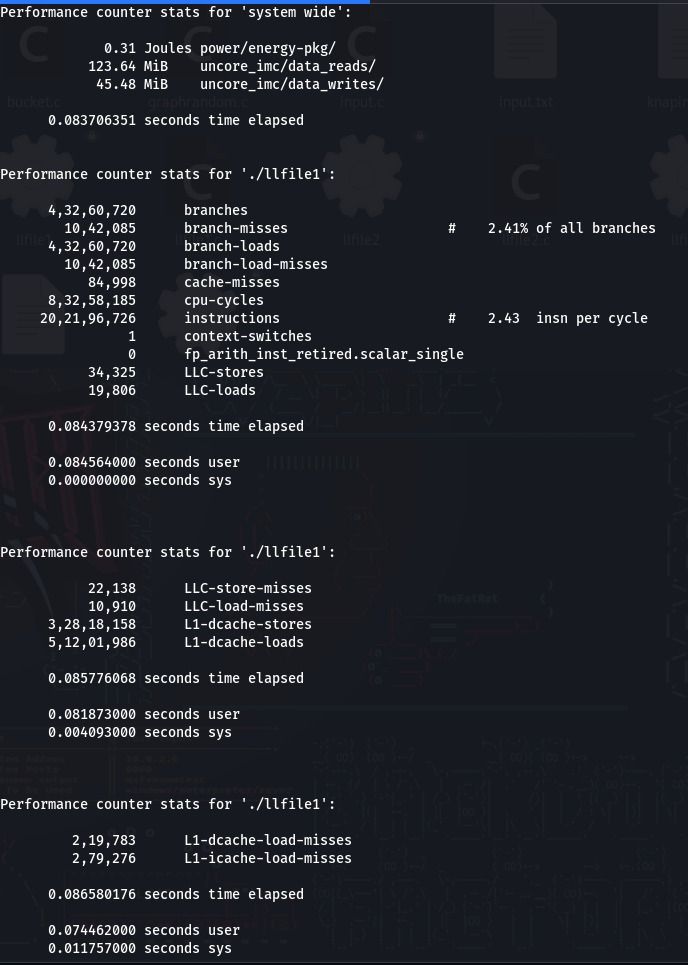 sudo perf stat -e LLC-store-misses,LLC-load-misses,L1-dcache-stores,L1-dcache-loads ./filename