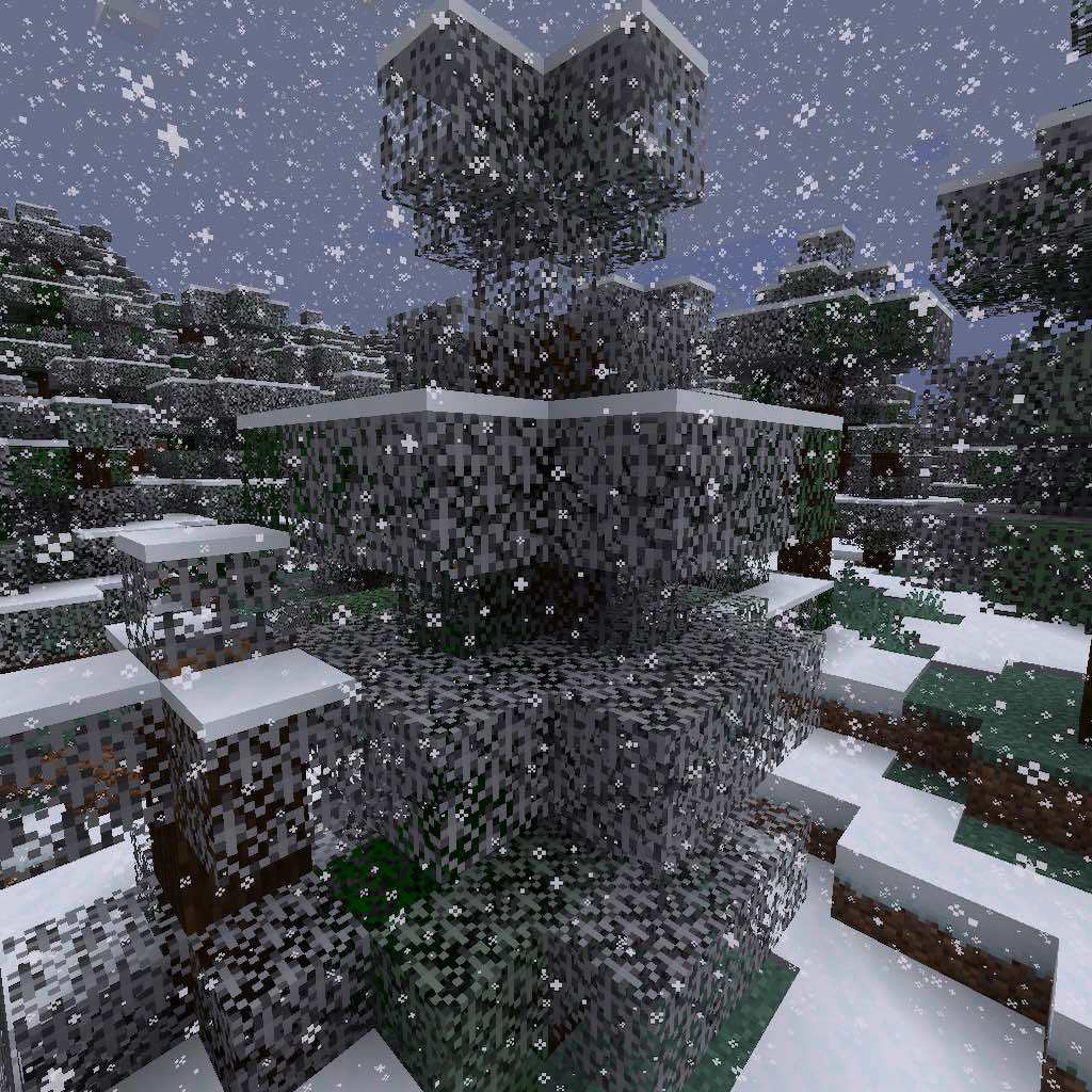 In Bedrock Edition, leaves slowly turn white when it is snowing. SnowyLeavesPlus brings this feature to Java Edition! When it is snowing, leaves will slowly turn white, and when it is not, they will turn back to normal.