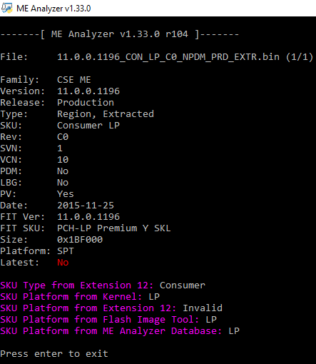 ME Analyzer is a tool which parses Intel Engine & PMC firmware images from the Converged Security Management Engine, Converged Security Trusted Execution Engine, Converged Security Server Platform Services, Management Engine, Trusted Execution Engine, Server Platform Services & Power Management Controller families. It can be used by end-users who are looking for all relevant firmware information such as Family, Version, Release, Type, Date, SKU, Platform etc. It is capable of detecting new/unknown firmware, checking firmware health, Updated/Outdated status and many more. ME Analyzer is also a powerful Engine firmware research analysis tool with multiple structures which allow, among others, full parsing and unpacking of Converged Security Engine (CSE) firmware, Flash Partition Table (FPT), Boot Partition Descriptor Table (BPDT/IFWI), CSE Layout Table (LT), advanced Size detection etc. Moreover, with the help of its extensive database, ME Analyzer is capable of uniquely categorizing all supported Engine firmware as well as check for any firmware which have not been stored at the Intel Engine Firmware Repositories yet.