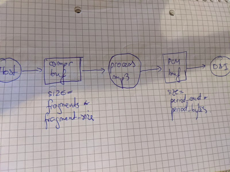 @dbaluta @paulstelian97 yes, there are 2 options for scheduling - the DAI or timer. I would imagine that downstream (PCM data) of the decoder will work as it does today. The upstream parts of the decoder (e.g. MP3) will only process data when the downstream PCM buffer has enough free space for the next uncompressed fragment (and this should be reflected in buffer size that connects decoder to downstream). |