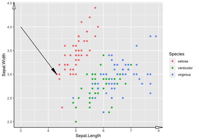 annotate("segment", x = 3, xend = min(iris$Sepal.Length), y = 4, yend = 3, arrow=arrow)