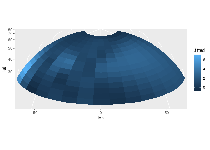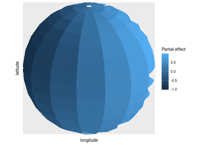 The regexp below simulates data on a sphere, fits a GAM to those data using mgcv and a spline on the sphere basis, and then plots the estimated spline using coord_map() to produce an orthographic projection.