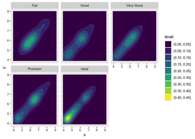 facet_wrap(~cut)d + geom_density_2d_filled(contour_var = "count") +