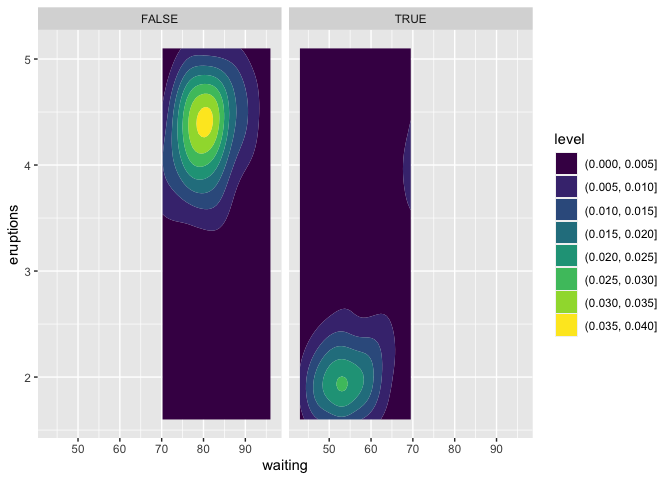 ggplot(faithfuld, aes(waiting, eruptions, z = density)) +