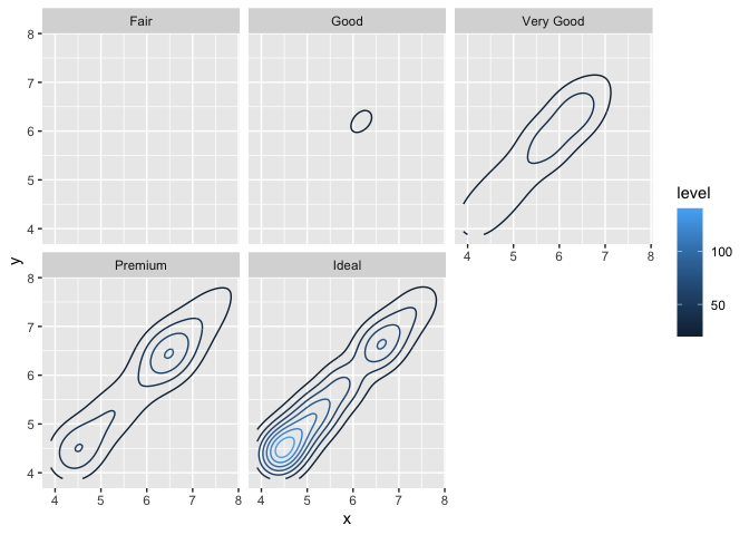facet_wrap(~cut)d + geom_density_2d(aes(color = after_stat(level))) +