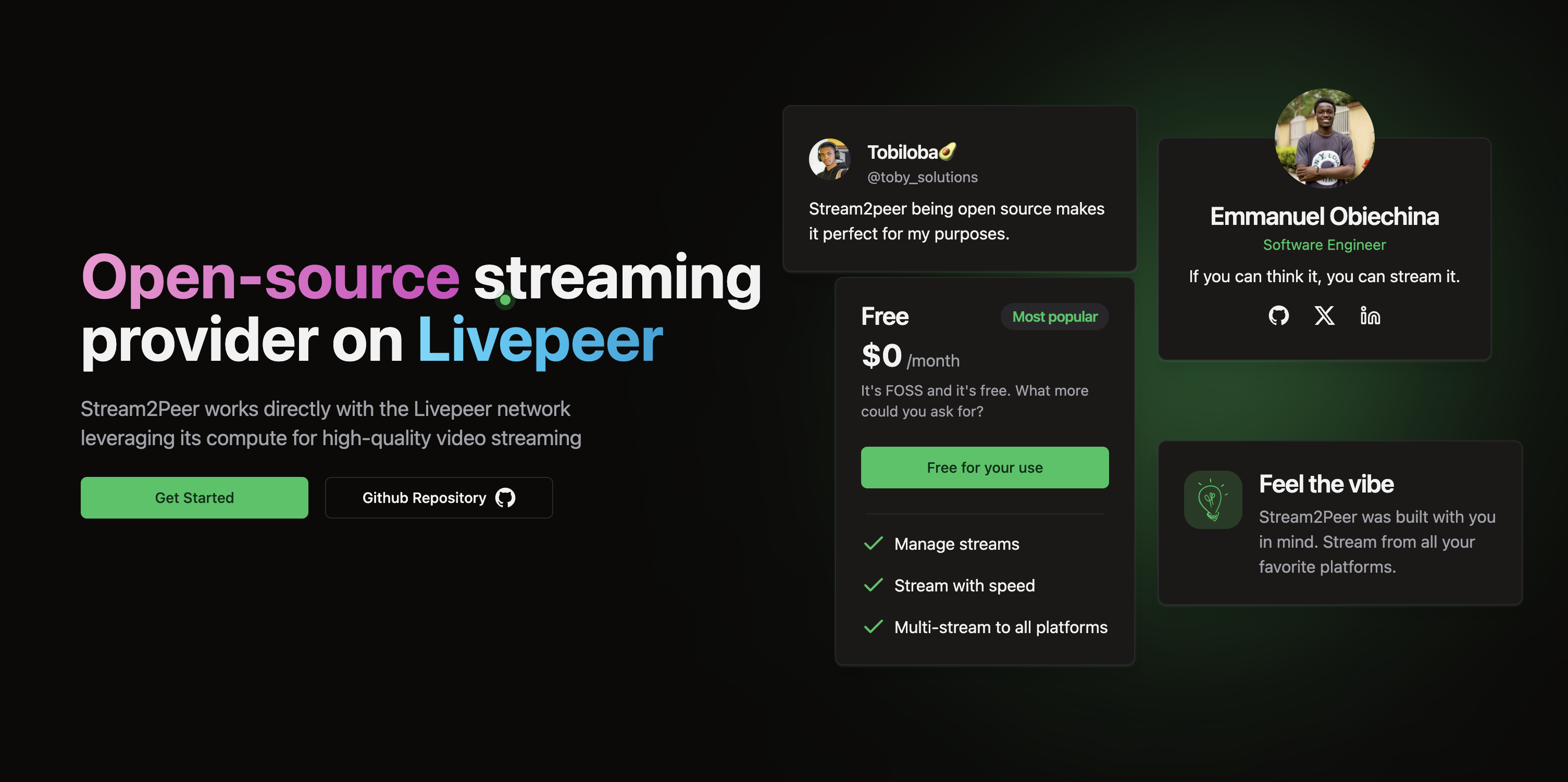 Stream2Peer is a decentralized video stream management platform built on top of Livepeer. Inspired by StreamYard, this project replicates the core functionalities of StreamYard with added advantages of decentralization, scalability, and enhanced user control. Stream2Peer allows users to broadcast, record, and manage live streams seamlessly using the power of Web3 and Livepeer's open-source technology.